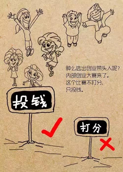 肿么选出创业带头人呢?内部创业大赛来了。这个比赛不打分,只投钱。竞选人上台宣讲拉人气,最后谁获得的投资额最多谁就胜出。