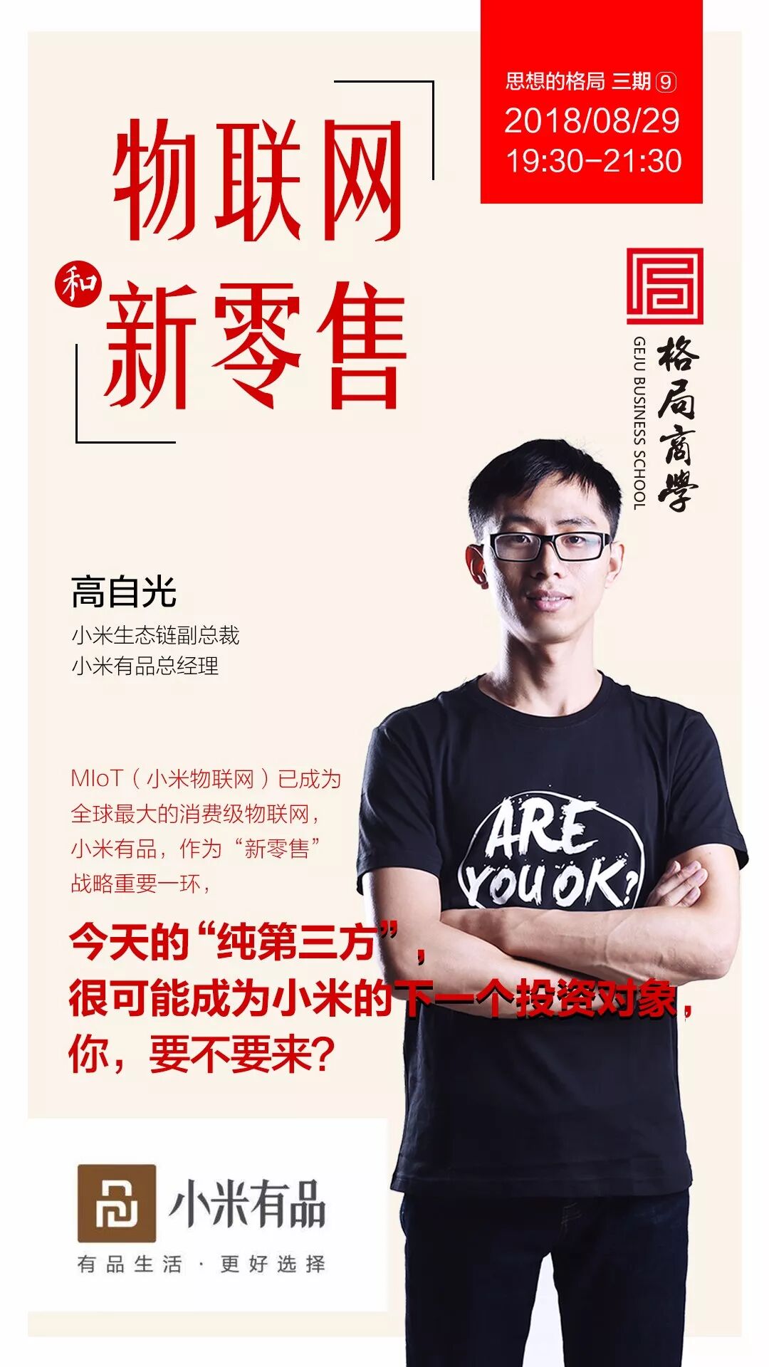 8月29日,19:30-21:30,小米生态链副总裁、小米有品电商总经理高自光将莅临思想的格局三期课堂,结合小米有品的案例,为创业者深度分享技术驱动下的新零售变革,以及有品的精品电商逻辑。